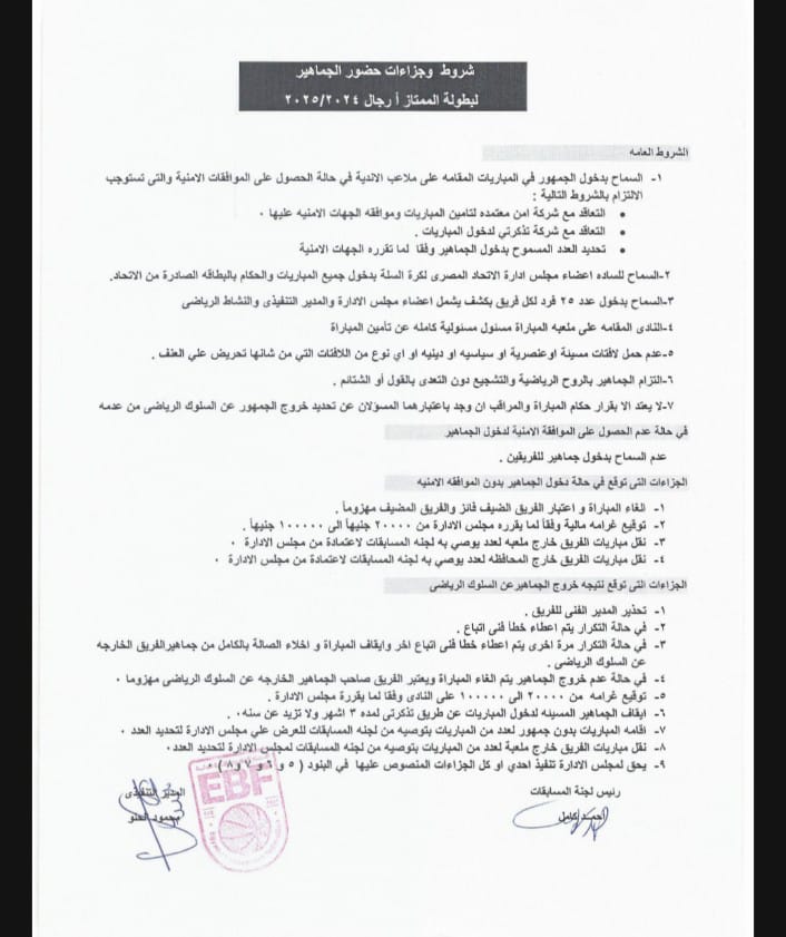 واستند اتحاد كرة السلة برئاسة عمرو مصيلحي في معاقبة جمهور الأهلي والاتحاد وفقا للائحة التي جاءت بنودها كالتالي:-