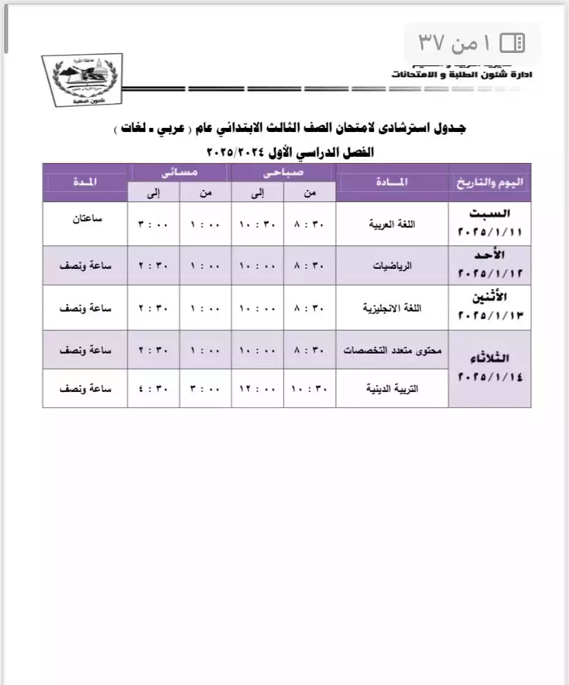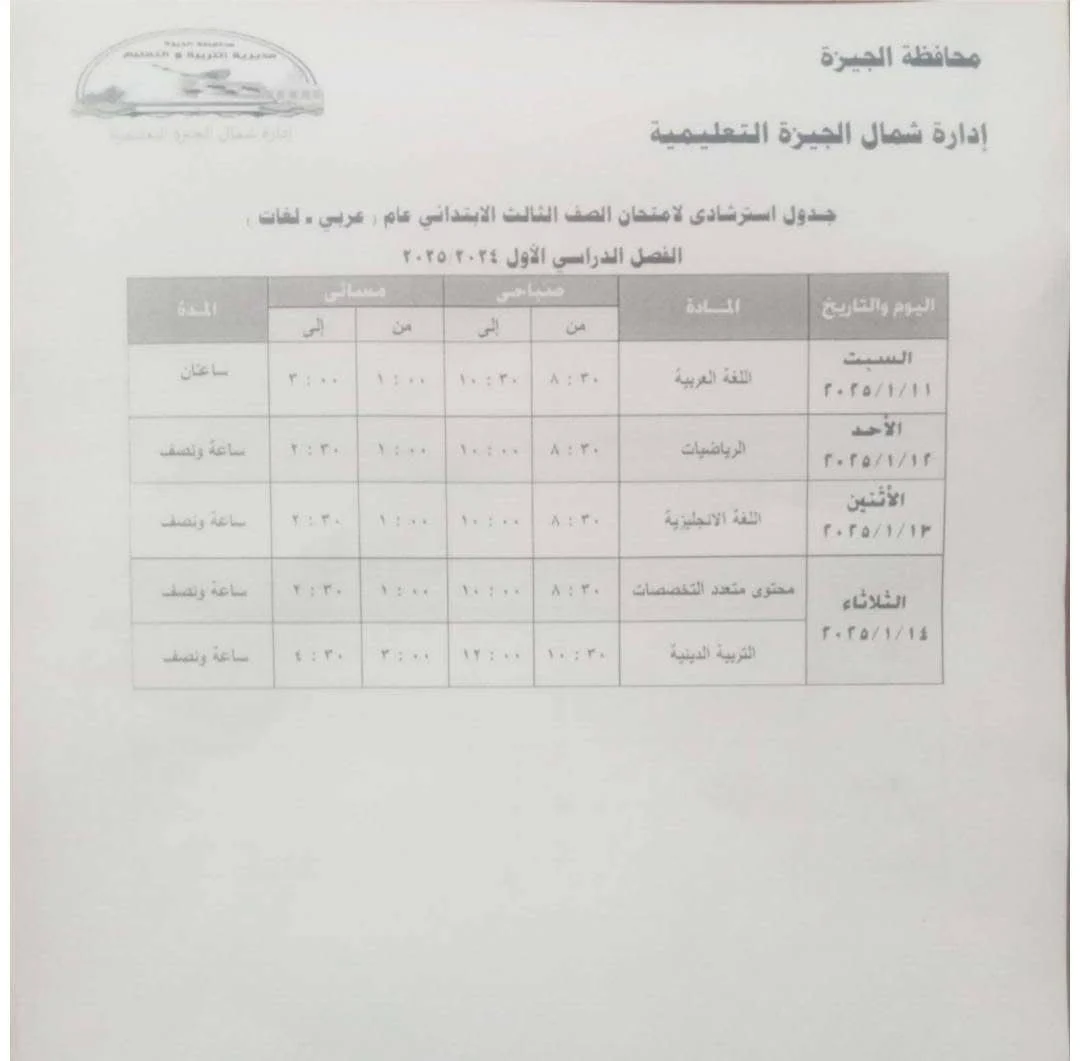 جدول امتحانات الصف الثالث الابتدائي الترم الأول 2025 الجيزة