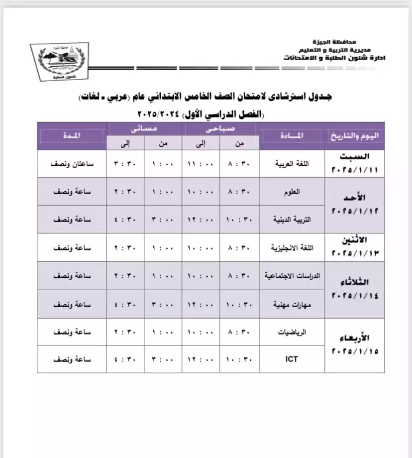 جدول امتحانات الصف الخامس الابتدائي محافظة الجيزة