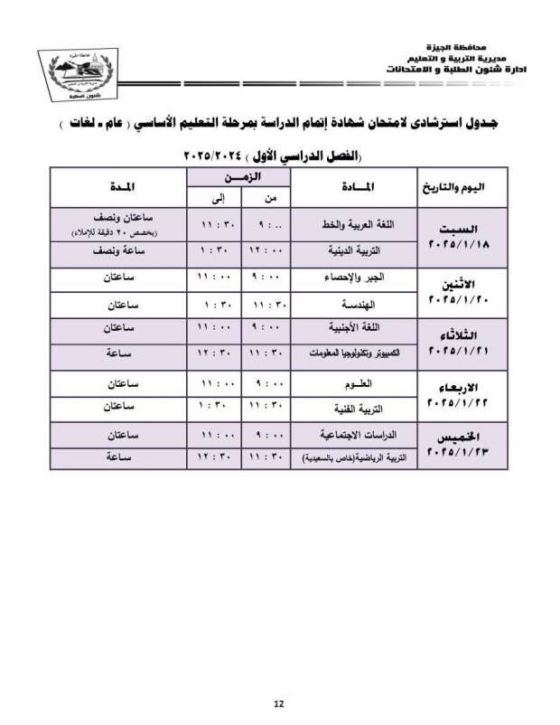 جدول المرحلة الابتدائية 2025 بمحافظة الجيزة