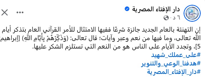 وأضافت الدار عبر منشور على صفحتها الرسمية بموقع التواصل الاجتماعي فيسبوك: قال تعالى: ﴿وَذَكِّرْهُمْ بِأَيَّامِ اللهِ﴾ [إبراهيم: 5]، وتجدد الأيام على الناس هو من النعم التي تستلزم الشكر عليها.