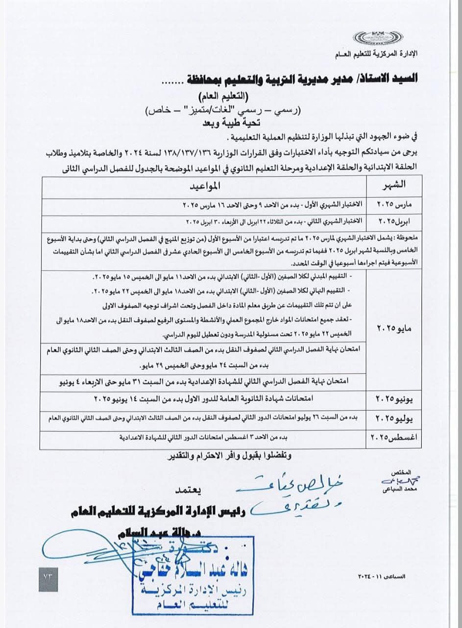 وأرسلت الإدارة العامة للامتحانات التابعة لوزارة التربية والتعليم والتعليم الفني، في وقت سابق، خطابًا إلى المديريات التعليمية بشأن موافقة وزير التربية والتعليم والتعليم الفني، بتاريخ 24 ديسمبر 2024 على الآتي: