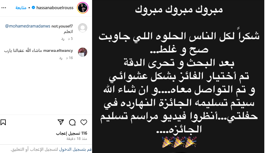 كتب حسن أبو الروس، منشورًا عبر حسابه الشخصي بموقع تبادل الصور والفيديوهات إنستجرام، وقال: مبروك لكل الناس الحلوة اللي جاوبت صح وغلط، بعد البحث وتحري الدقة تم اختيار الفائز بشكل عشوائي وتم التواصل معه، وإن شاء الله سيتم تسليمه الجائزة النهاردة في حفلتي، انظروا فيديو مراسم تسليم الجائزة.