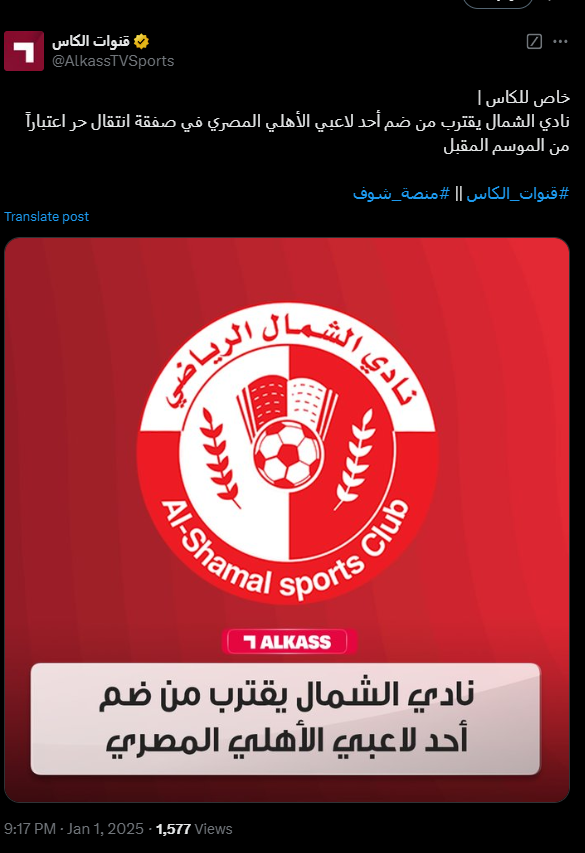وكتب الحساب الرسمي لقنوات الكأس القطرية عبر موقع التواصل الاجتماعي إكس: نادي الشمال القطري يقترب من ضم أحد لاعبي الأهلي المصري في صفقة انتقال حر اعتبارًا من الموسم المقبل.