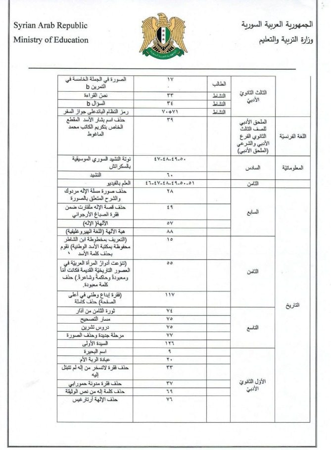 وقررت الإدارة السورية حذف حديث: والله لوْ وضعوا الشمس في يميني، وفي مادة العلوم تم حذف عبارة عطاء الطبيعة وأصبحت عطاء الله، وفي اللغة الإنجليزية قررت الإدارة حذف عدد من الصور التي وردت في دروس مختلفة.