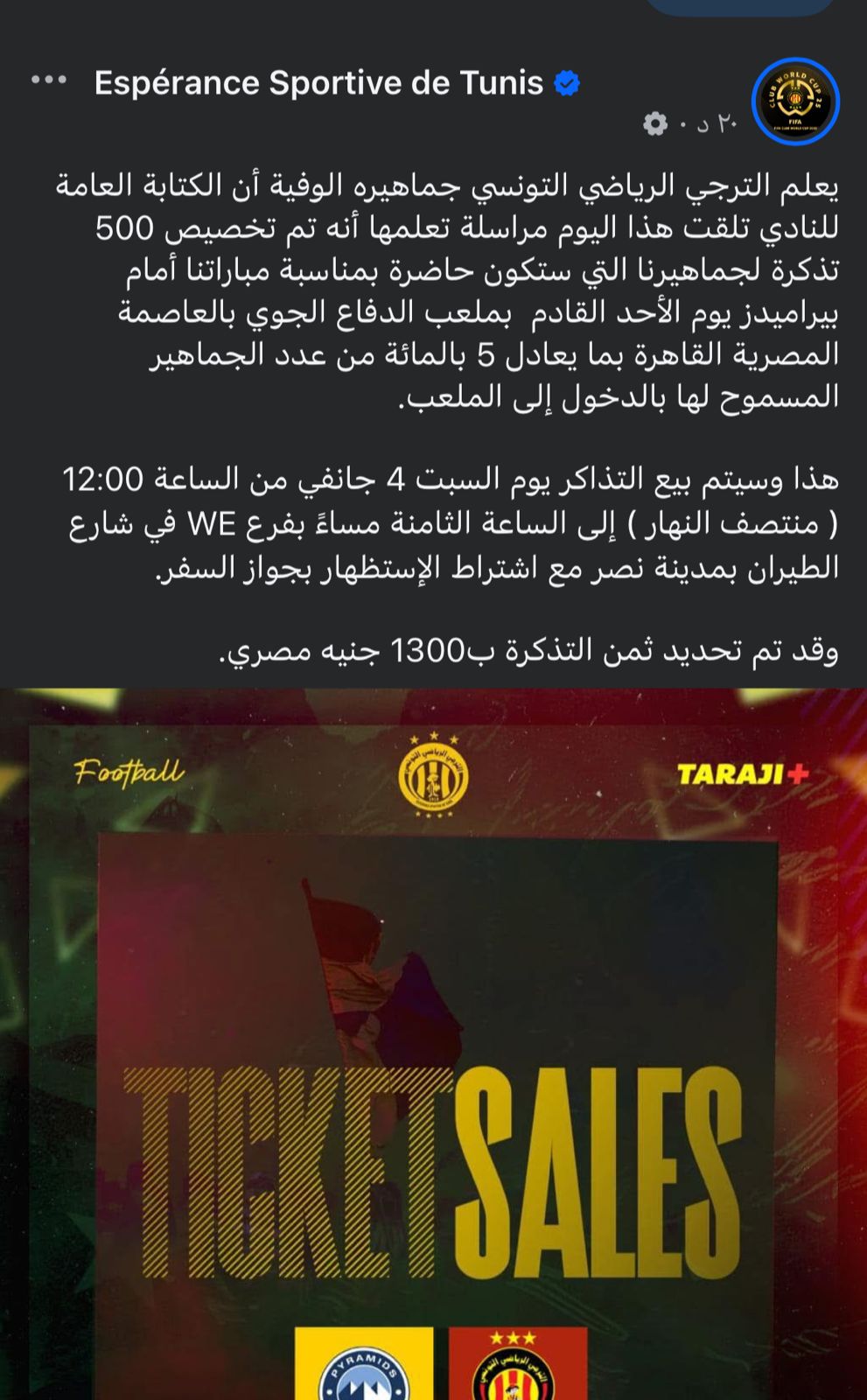 أعلن نادي الترجي التونسي، تخصيص 500 تذكره لجماهيره، أمام بيراميدز في المباراة التي تجمع بين الفريقين يوم الأحد في دوري أبطال إفريقيا.