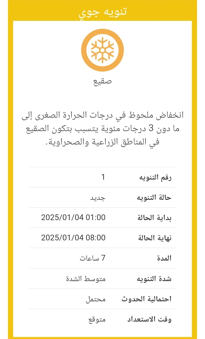 وأطلقت الأرصاد تحذيرا من انخفاض ملحوظ في درجات الحرارة الصغرى إلى ما دون 3 درجات مئوية يتسبب بتكون الصقيع في المناطق الزراعية والصحراوية.