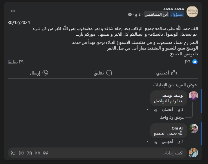 وانهالت التعليقات، متسائلين عن السعر وهل هو بالفعل ربع مليون جنيه؟ أم لا، وقال أحد الأشخاص في التعليقات على المنشور: «أنا سألته وقالي ربع مليون جنيه من ليبيا إلى إيطاليا»، ليرد عليه حساب آخر قائلًا: «طب مين هيسافر من مصر لليبيا وبعدها لإيطاليا عشان نطلع سوا؟»، في إشارة منهم إلى عزمهم على الذهاب في الرحلة دون أي ضمانات رغم الموت والغرق المحتمل.