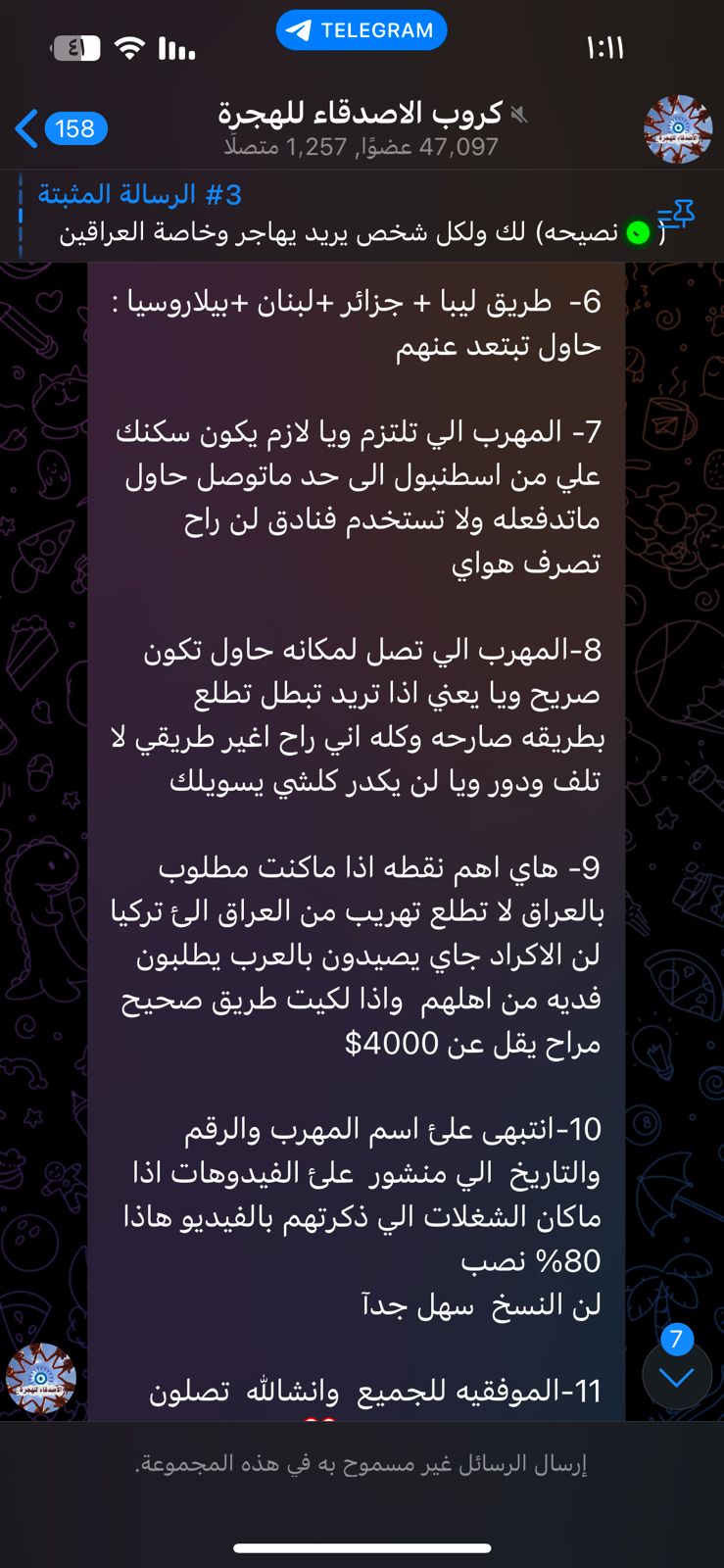 «نصيحة لك ولكل شخص يريد أن يهاجر، لا تثق بأي مهرب، ولا تسمع كلام الأطفال بعدك سفرك، وإذا لا تملك مبلغ السفر المطلوب فلا تسافر، ولا تستعجل واسأل على المهرب، وإذا كنت تملك أطفال وتريد تهريبهم معك فيجب دفع 7 آلاف دولار للطفل الواحد، طريق ليبيا + جزائر +لبنان +بيلاروسيا حاول تبتعد عنهم، مرفقًا أرقام هاتفه المحمول للتواصل معه وحجز الرحلة، رسالة مثبته على الجروب ضمت نحو 10 نصائح للمهاجر غير الشرعي، وتحذير من طريق ليبيا والجزائر ولبنان وبيلاروسيا.