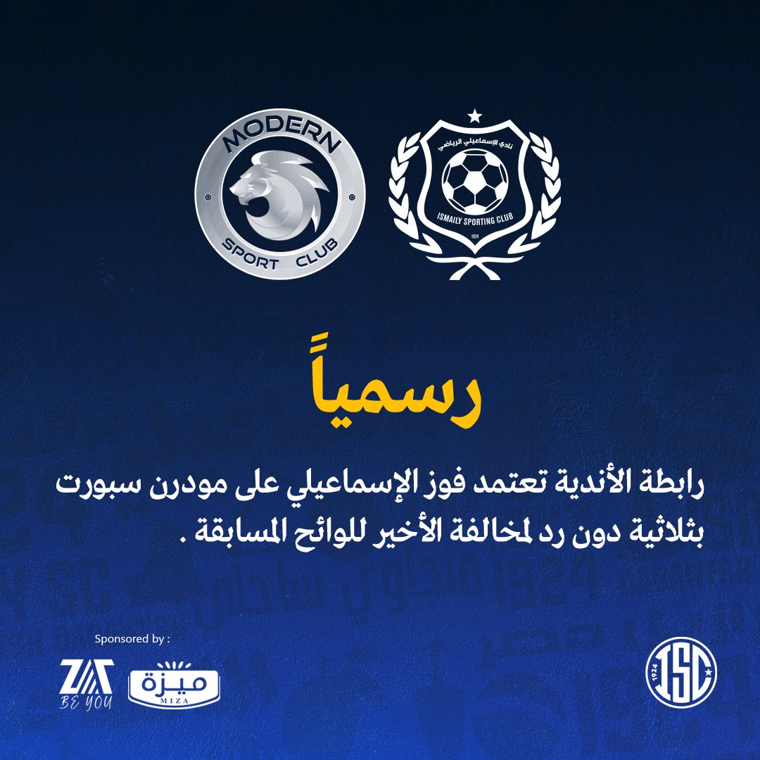 وقال الإسماعيلي في بيان مقتضب: رابطة الأندية تعتمد فوز الإسماعيلي على مودرن سبورت بثلاثية دون رد لمخالفة الأخير للوائح المسابقة.
