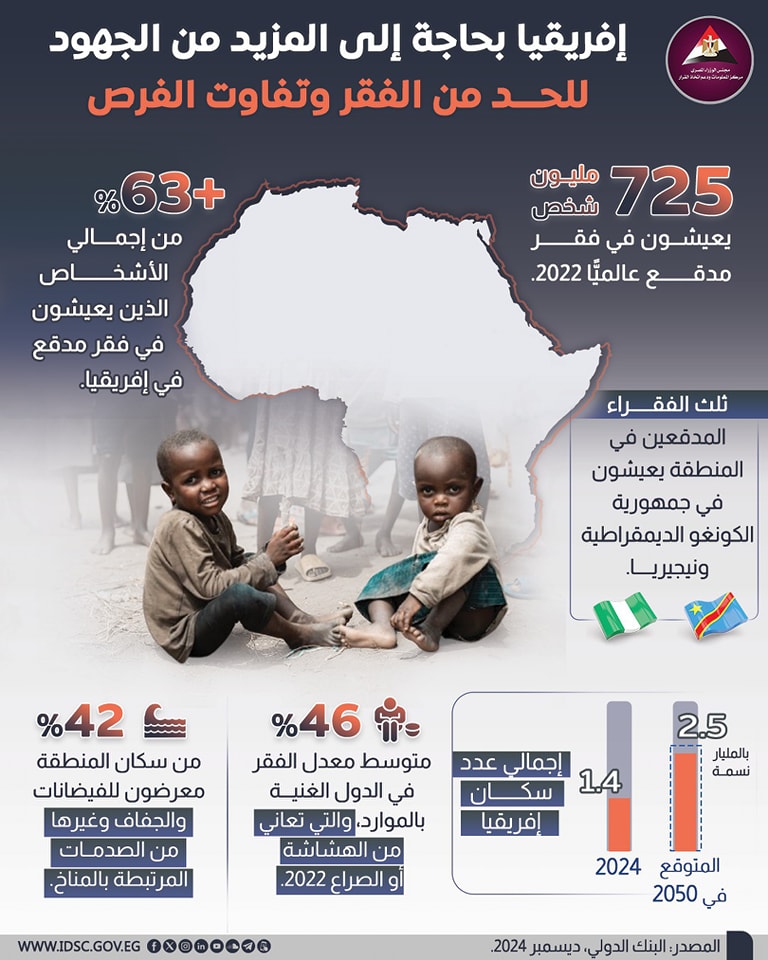 وأوضح مركز معلومات الوزراء، خلال انفوجراف منشور عبر صفحته الرسمية على فيس بوك، أن أكثر من نصف الفقراء في العالم يعيشون في إفريقيا، ويعانون من سوء التغذية، ونقص الخدمات الأساسية، والصراعات.