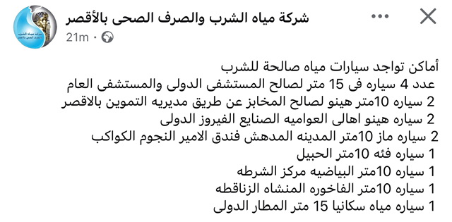 وفرت شركة مياه الشرب والصرف الصحي بالأقصر 14 سيارة مياه عذبة صالحة للشرب، لتلبية احتياجات المواطنين في عدة مناطق بعد انقطاع المياه عنهم لأكثر من 12 ساعة، وذلك بسبب أعمال إصلاح كسر في خط طرد الصرف الصحي بقطر 700 مم في نجع الحمرية بالحبيل.