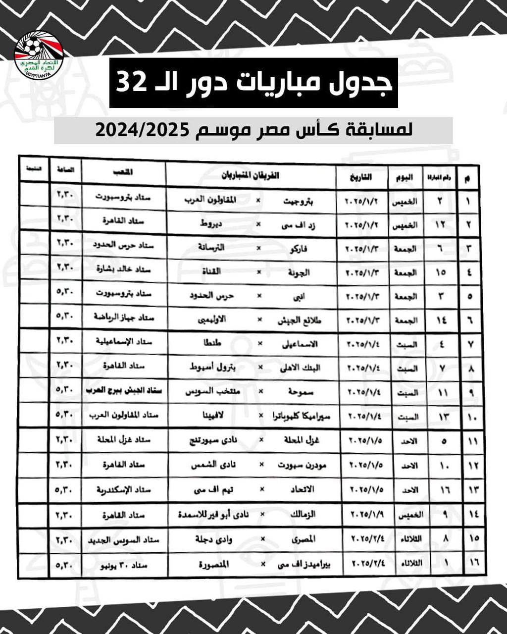 قررت إدارة المسابقات بالاتحاد المصري لكرة القدم، تعديل موعد مباراتي بيراميدز والمنصورة، والمصري ووادي دجلة ضمن منافسات دور الـ32 من بطولة كأس مصر، واللتين كان من المقرر لهما يوم 8 يناير الجاري، وذلك بسبب ظروف الطيران وارتباط فريقي بيراميدز والمصري بمواجهات في بطولتي دوري الأبطال والكونفدرالية خارج الديار.