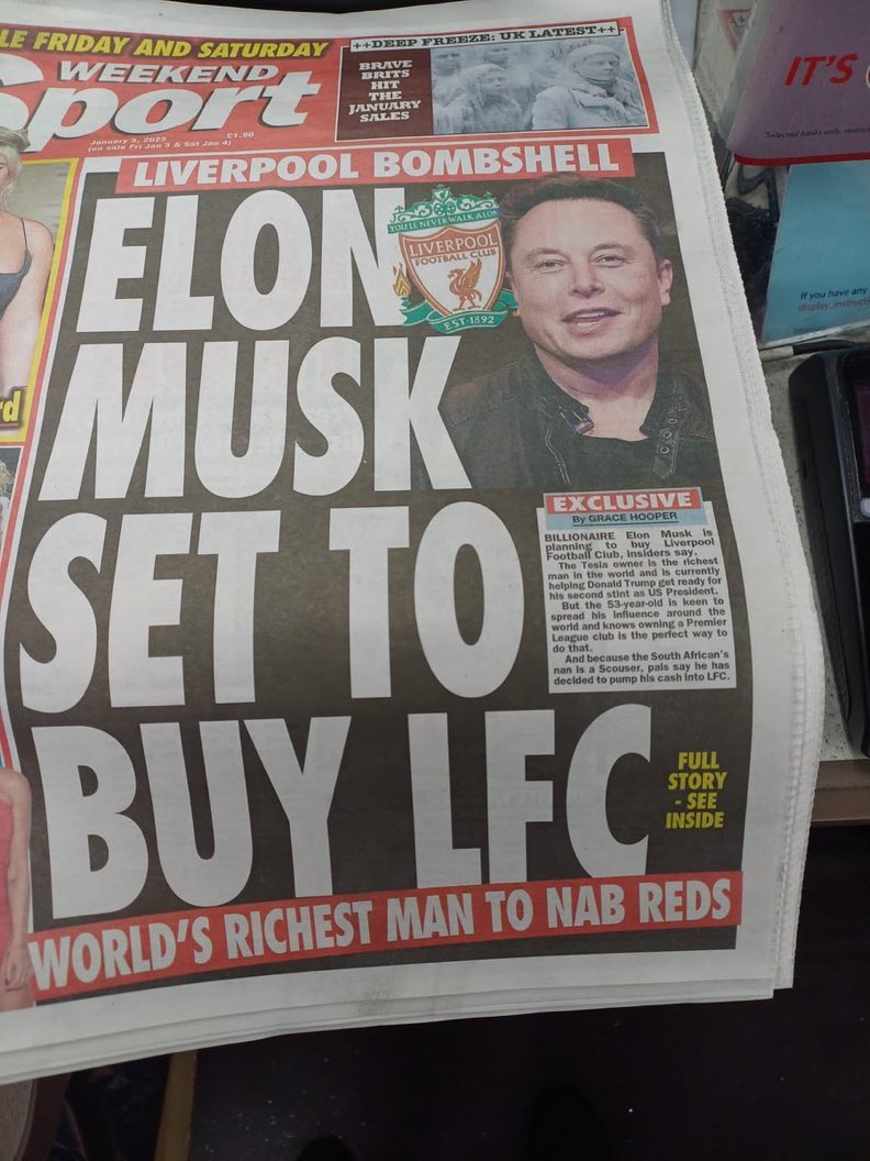 ووفقًا لصحيفة Weekend Sport الإنجليزية، فقد أظهر إيلون ماسك الذي تقدر ثروته بـ421.2 مليار دولار اهتمامه بشراء نادي ليفربول الإنجليزي.