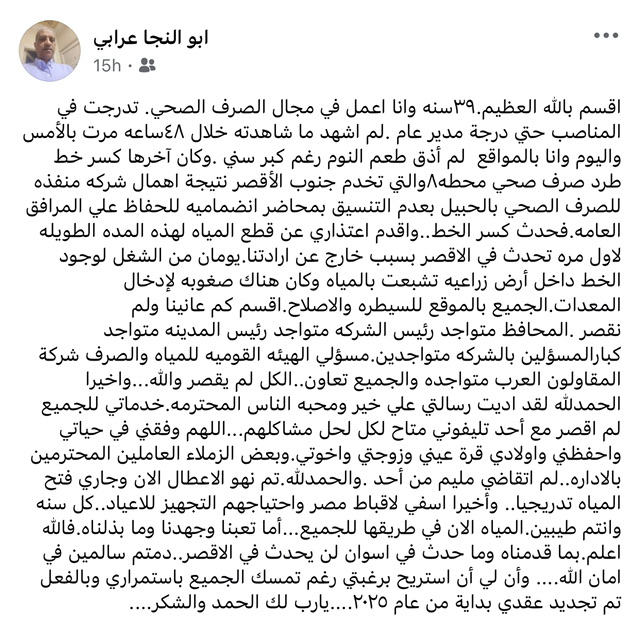 وأعرب عرابي عن اعتذاره للمواطنين، لا سيما الأقباط الذين كانوا بحاجة إلى المياه لتجهيز احتفالاتهم بالأعياد، مؤكدًا أن الوضع تحت السيطرة وما حدث لن يتكرر في الأقصر.