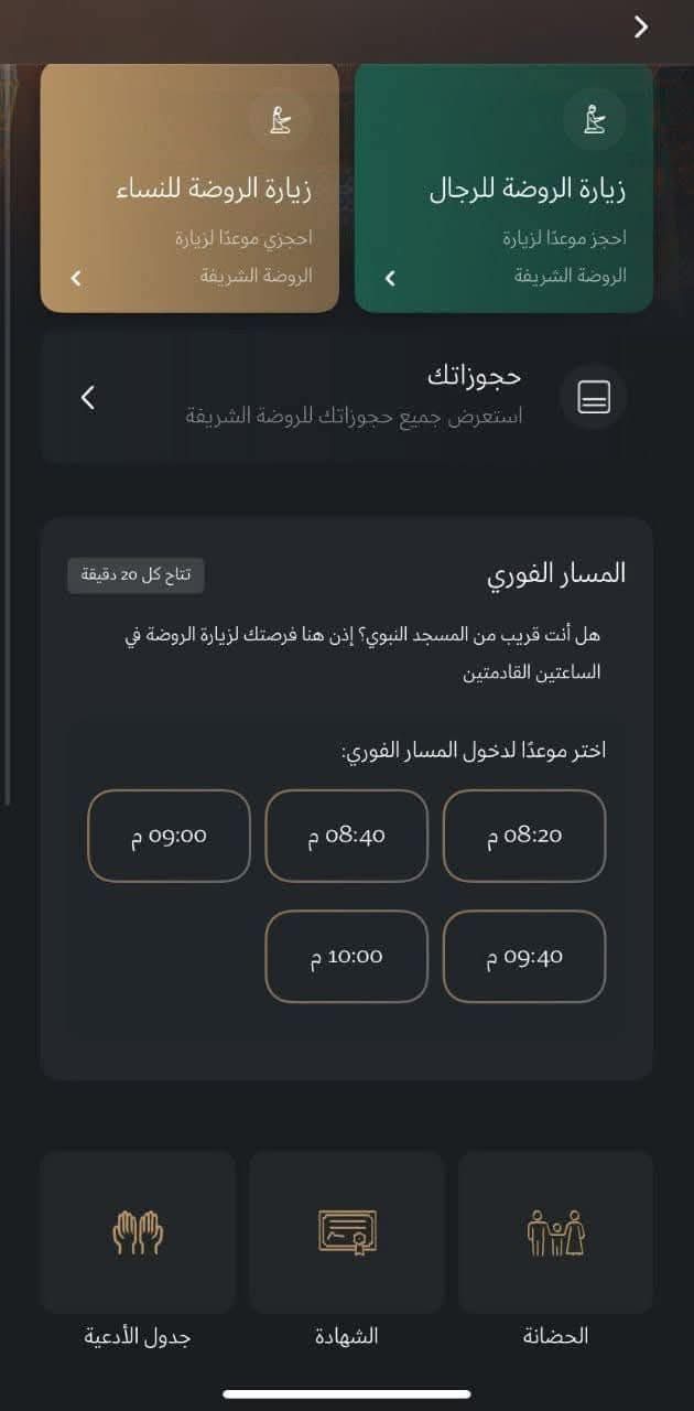 أتاح تطبيق نسك خدمة المسار الفوري لزيارة الروضة الشريفة، وذلك خلال حجز سريع في مواعيد محدد يطرحها التطبيق على المعتمرين بالمملكة بشرط الوجود قرب المسجد النبوي.