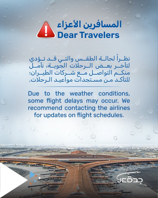 وأوضح مطار الملك عبد العزيز الدولي في بيان له، أنه نظرًا لحالة الطقس والتي قد تؤدي لتأخر بعض الرحلات الجوية فإنه على المسافرين التواصل مع شركات الطيران للتأكد من مستجدات مواعيد الرحلات الجوية.