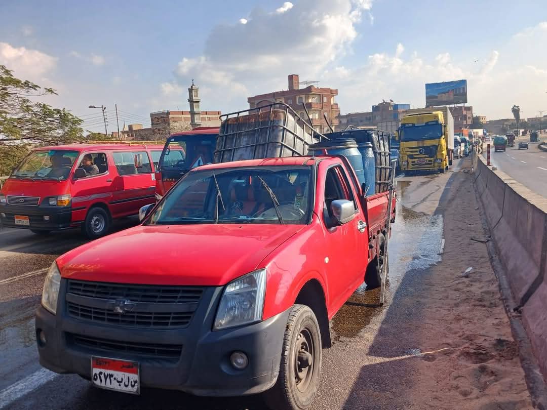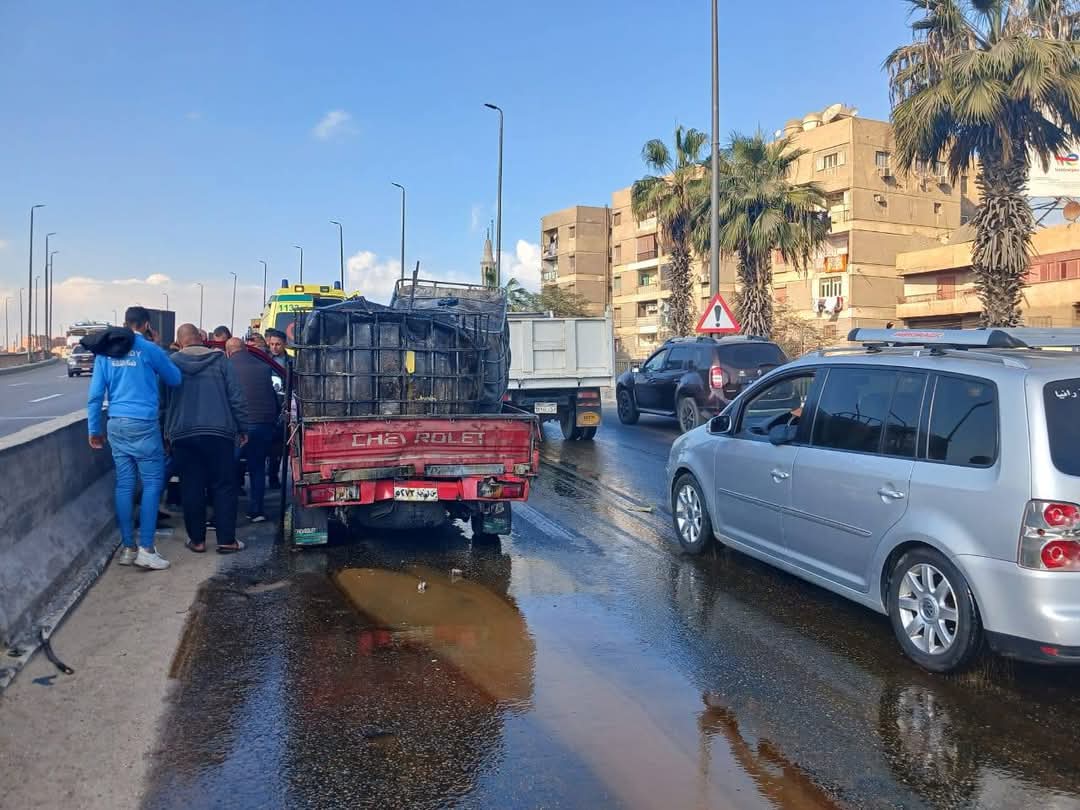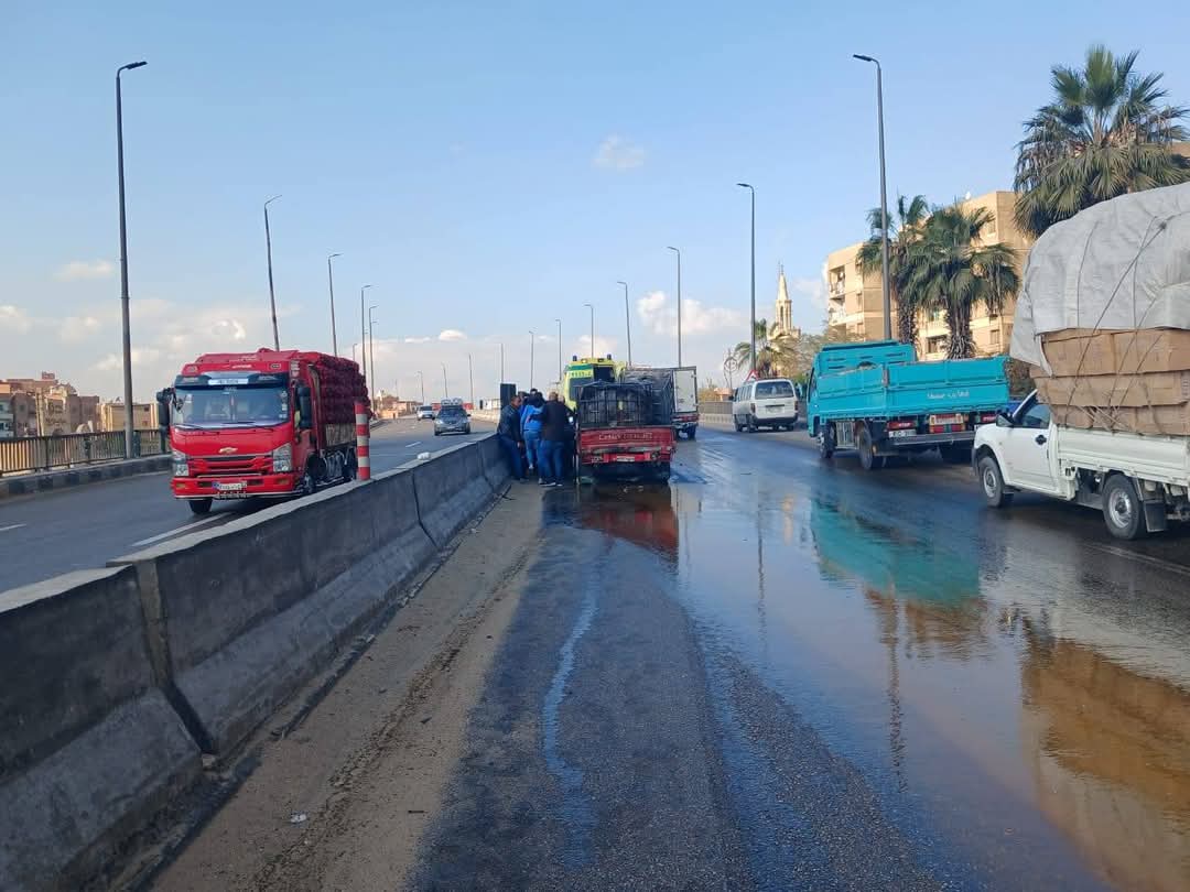 سقوط حمولة زيت على كوبري قويسنا بعد تصادم سيارتين.. وتحرك الجهات المعنية بالمنوفية| صور
