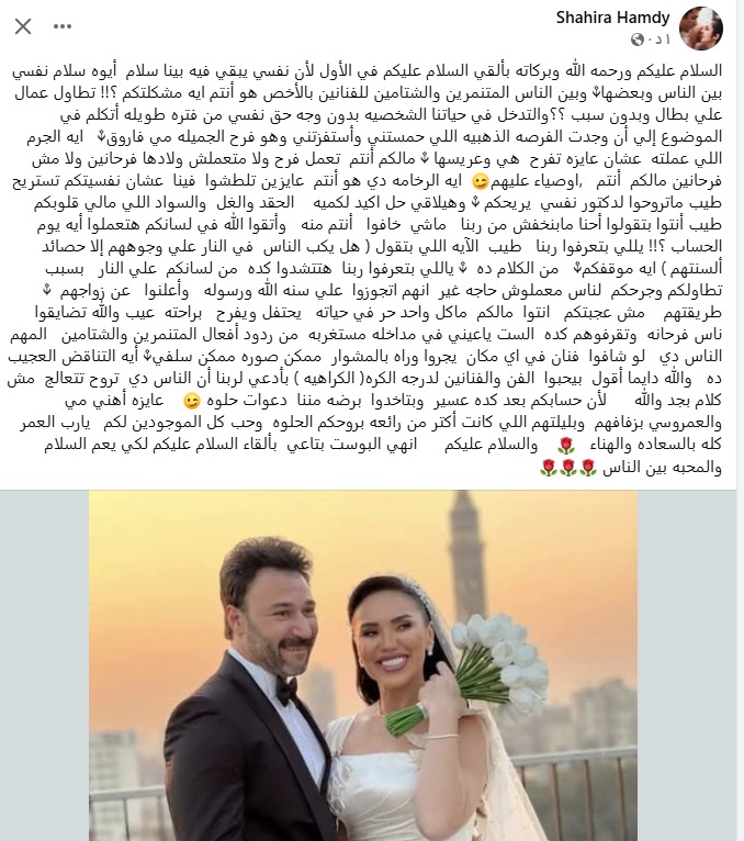 وقالت شهيرة عبر حسابها الشخصي بموقع التواصل الاجتماعي فيسبوك: أنتم إيه مشكلتكم ؟!! تطاول عمال على بطال وبدون سبب ؟؟ والتدخل في حياتنا الشخصية بدون وجه حق.. نفسي من فترة طويلة أتكلم في الموضوع إلى أن وجدت الفرصة الذهبية اللي حمستني واستفزتنى وهو فرح الجميلة مي فاروق.