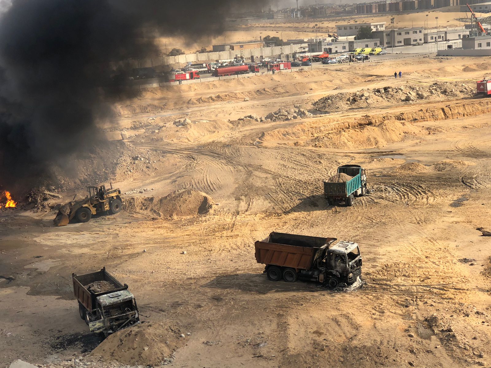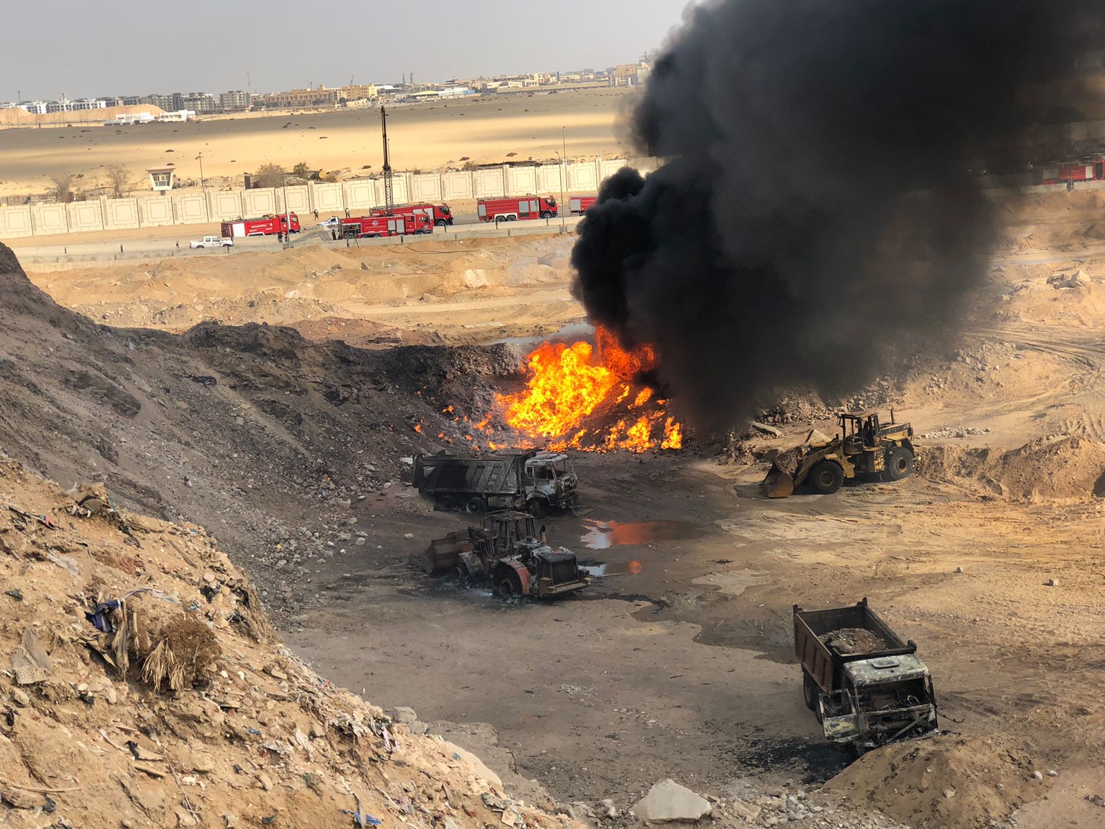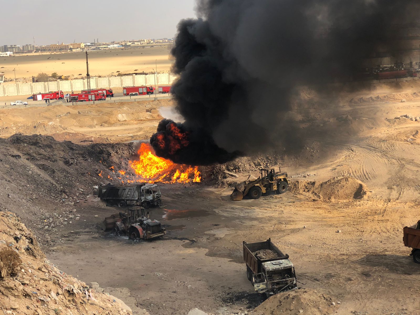 وتظهر الصور، تفحم 4 سيارات نقل ثقيل، و2 لودر جراء الحريق، وأسفر الحادث عن وفاة شخص وإصابة 8 آخرين جرى نقلهم لمستشفى السلام.