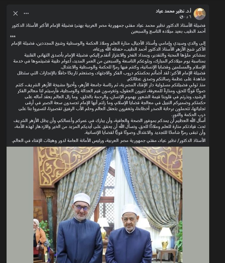 وقال المفتي في رسالته عبر الموقع صفحته الرسمية بموقع التواصل الاجتماعي فيسبوك: إلى والدي وسيدي وإمامي وأستاذ الأجيال، منارة العلم وملاذ الحكمة والوسطية وشيخ المجددين، فضيلة الإمام الأكبر شيخ الأزهر الدكتور أحمد الطيب.. بمشاعر ملؤها المحبة والتقدير، وبمداد الفخر والاعتزاز أتقدم إليكم، فضيلة الإمام بأصدق التهاني القلبية بمناسبة يوم ميلادكم المبارك، وبلوغكم التاسعة والسبعين من العمر المديد، أعوام طيبة قضيتموها في خدمة الإسلام والمسلمين وقضايا الإنسانية، وكنتم فيها رمزًا للحكمة والوسطية والاعتدال.