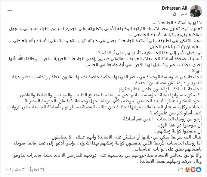 وأضاف حسن علي قائلا: أمسينا مضحكة أساتذة الجامعات العربية، هاتفني صديق من إحدى الجامعات العربية ساخرا، وحالفا بالله بأنها إحدى عجائب مصر ولا مثيل لهذا الإجراء في أي جامعة في العالم.