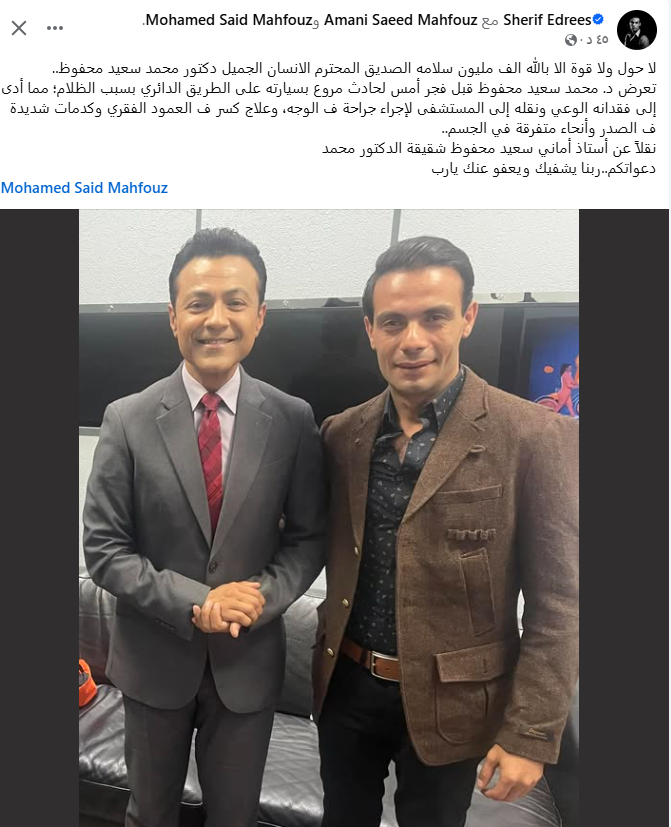 وكتب شريف إدريس منشورًا، عبر حسابه الشخصي بموقع التواصل الاجتماعي فيس بوك، قال فيه: لا حول ولا قوة إلا بالله ألف مليون سلامة الصديق المحترم الإنسان الجميل دكتور محمد سعيد محفوظ، تعرض دكتور محمد سعيد محفوظ قبل فجر أمس، لحادث مروع بسيارته على الطريق الدائري بسبب الظلام؛ ما أدى إلى فقدانه الوعي ونقله إلى المستشفى لإجراء جراحة في الوجه، وعلاج كسر في العمود الفقري وكدمات شديدة في الصدر وأنحاء متفرقة في الجسم.. وذلك نقلًا عن أستاذ أماني سعيد محفوظ شقيقة الدكتور محمد.. دعواتكم..ربنا يشفيك ويعفو عنك يا رب.