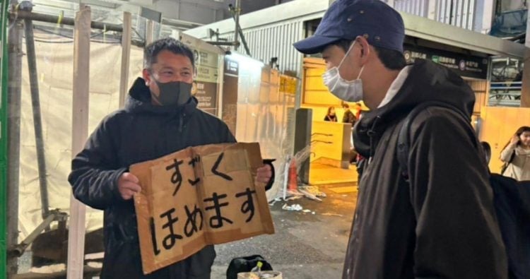 وبدأ يتجول في طوكيو حاملًا قطعة من الورق المقوى مكتوب عليها أنا أثني عليك كثيرًا، قد يبدو الأمر وكأنه طريقة غريبة لكسب المال.
