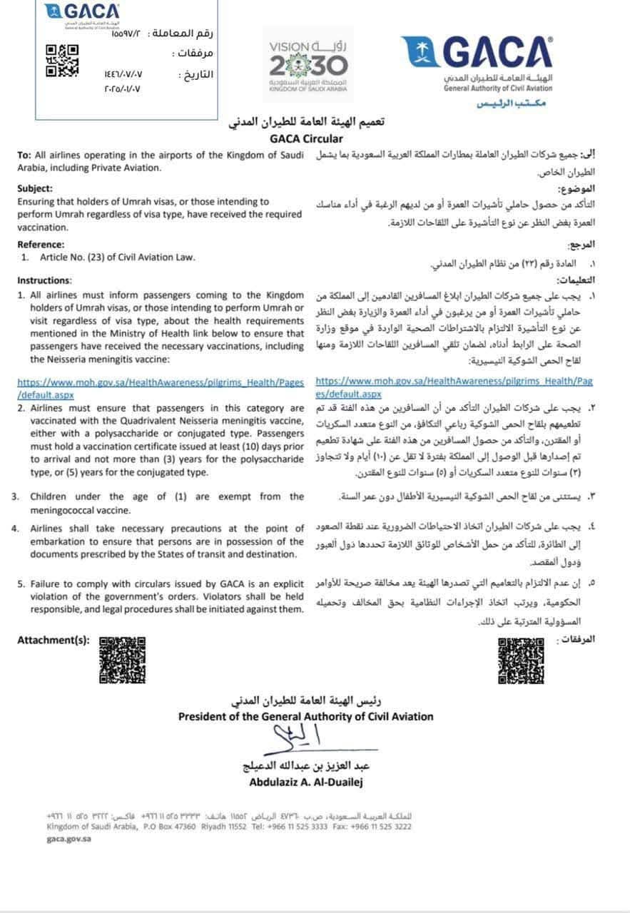 والزمت الهيئة العامة للطيران المدني السعودي في بيان لها، جميع شركات الطيران العاملة بمطارات المملكة العربية السعودية بما يشمل الطيران الخاص، إبلاغ المسافرين القادمين إلى المملكة من حاملي تأشيرات العمرة أو من يرغبون في أداء العمرة والزيارة بغض النظر عن نوع التأشيرة الالتزام بالاشتراطات الصحية الواردة في موقع وزارة الصحة السعودية لضمان تلبي المسافرين التطعيمات اللازمة.