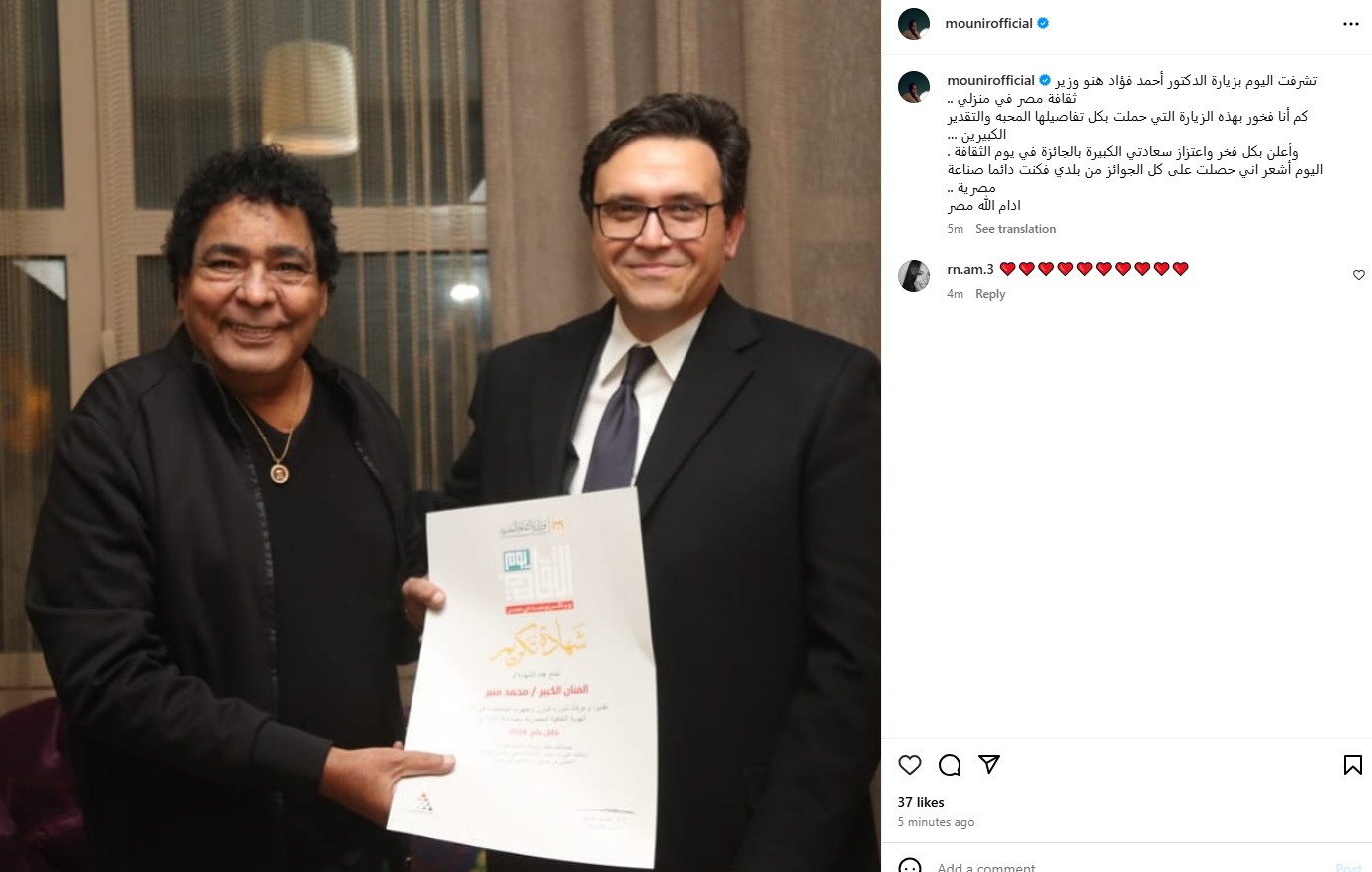 ونشر الكينج محمد منير عبر حسابه الرسمي على انستجرام صورة جمعته بالوزير خلال الزيارة، معلقًا: تشرفت اليوم بزيارة الدكتور أحمد فؤاد هنو وزير ثقافة مصر في منزلي، كم أنا فخور بهذه الزيارة التي حملت بكل تفاصيلها المحبة والتقدير الكبيرين.