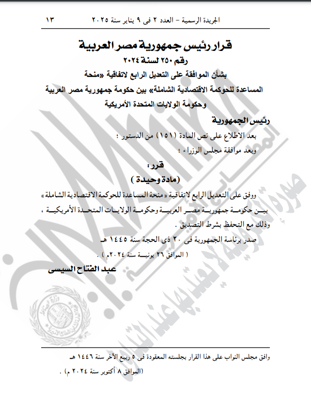 ونص القرار الصادر في الجريدة الرسمية، على أنه تمت الموافقة على التعديل الرابع لاتفاقية منحة المساعدة للحوكمة الاقتصادية الشاملة بين حكومة جمهورية مصر العربية، وحكومة الولايات المتحدة الأمريكية، وذلك مع التحفظ بشرط التصديق.