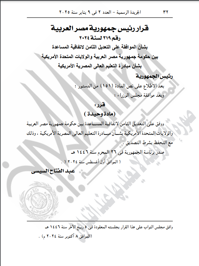 ونص القرار على أنه تم الموافقة على التعديل الثامنة لاتفاقية منحة المساعدة بين حكومة جمهورية مصر العربية وحكومة الولايات المتحدة الأمريكية، بشأن مبادرة التعليم العالي المصرية الأمريكية، وذلك مع التحفظ بشرط التصديق.