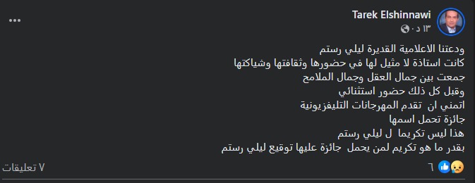 كتب طارق الشناوي منشورًا عبر حسابه الشخصي بموقع فيسبوك، جاء فيه: ودعتنا الإعلامية القديرة ليلي رستم، كانت أستاذة لا مثيل لها في حضورها وثقافتها وشياكتها، جمعت بين جمال العقل وجمال الملامح، وقبل كل ذلك حضور استثنائي.