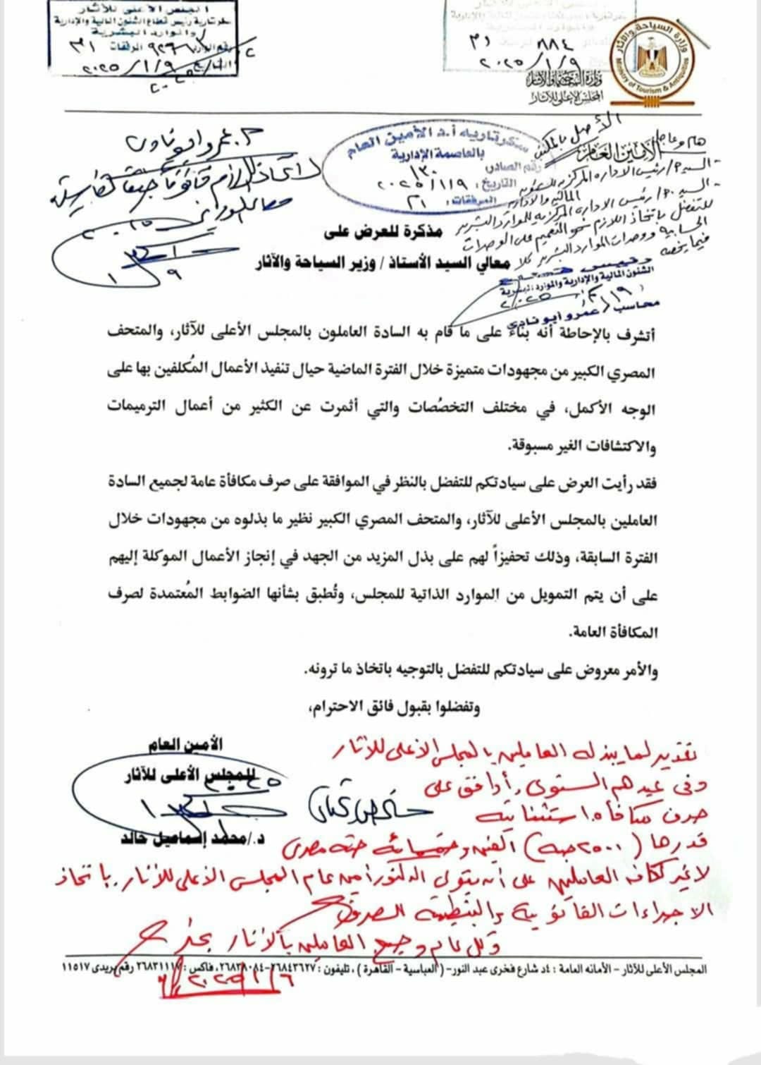 فقد رأيت العرض على سيادتكم للتفضل بالنظر في الموافقة على صرف مكافأة عامة لجميع العاملين بالمجلس الأعلى للآثار والمتحف المصري الكبير نظير ما بذلوه من مجهودات خلال الفترة السابقة، وذلك تحفيزًا لهم على بذل المزيد من الجهد في إنجاز الأعمال الموكلة إليهم على أن يتم التمويل من الموارد الذاتية للمجلس، وتُطبق بشأنها الضوابط المعتمدة لصرف المكافأة العامة.