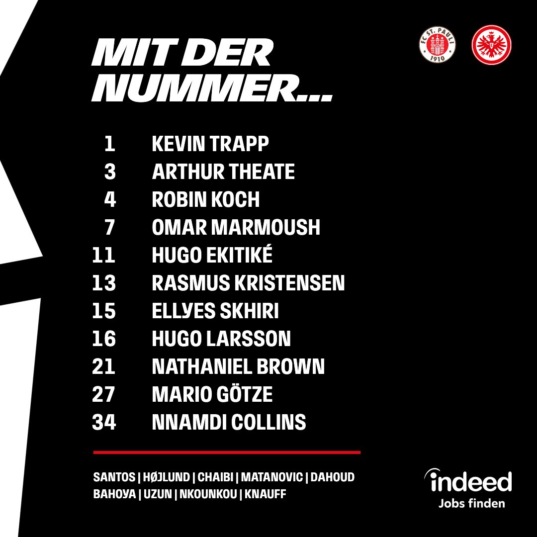 أعلن دينو توبمولر المدير الفني لفريق آينتراخت فرانكفورت تشكيل لاعبيه لمواجهة سانت باولي، في المباراة المقرر انطلاقها في تمام الساعة 4:30 عصرًا، ضمن منافسات الجولة الـ 16 في مسابقة الدوري الألماني.