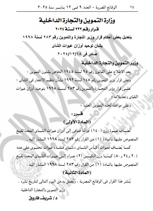 وقالت الجريدة الرسمية، إن المادة الأولى من القرار تضمنت بأن تضاف عبوة وزن 140 جرامًا صافي إلى أوزان عبوات الشاي المعدة للبيع المنصوص عليها بالمادة 1 من القرار رقم 283 لسنة 1998 المشار إليه.