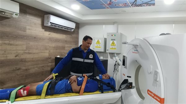 وخلال لحظات، أجرى المسعف فحص أولي للاعب المصاب، حيث تبين وجود اشتباه كسر في إحدى الفقرات العنقية، وعليه قام بفتح مجرى التنفس، وتركيب الجبيرة العنقية، لتأمين وتثبيت فقرات الرقبة منعًا لحدوث مضاعفات طبية، وتمهيدًا لنقله لأقرب مستشفى.