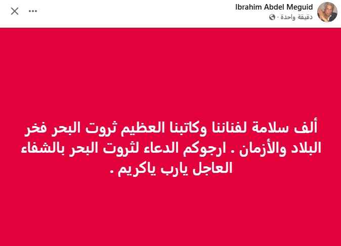 وكتب الروائي إبراهيم عبد المجيد، أحد أصدقاء الكاتب ثروت البحر، منشورًا يطالب فيه محبيه بالدعاء للفنان بـ الشفاء العاجل، حيث قال عبر فيس بوك: ألف سلامة لـ فنانا وكاتبنا العظيم ثروت البحر، فخر البلاد والأزمان، أرجوكم الدعاء لـ ثروت البحر بـ الشفاء العاجل، يا رب يا كريم.