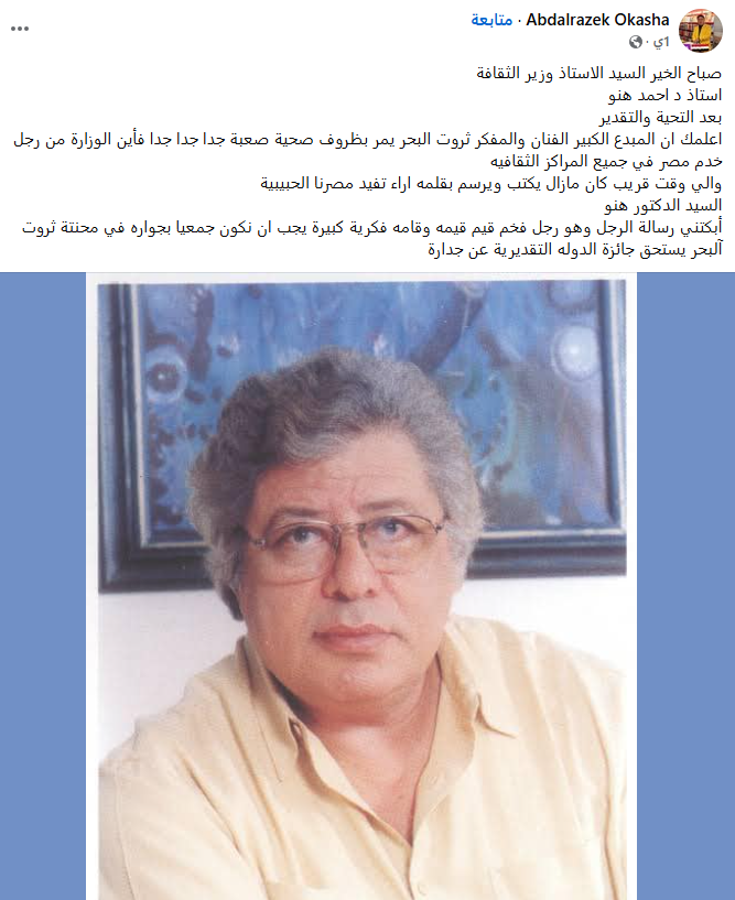 وأضاف صديق ثروت البحر: إلى الدكتور هنو، أبكتني رسالة الرجل، وهو رجل فخم قيم قيمة وقامة فكرية كبيرة، يجب أن نكون جميعًا بجواره في محنته، ثروت البحر يستحق جائزة الدولة التقديرية عن جدارة.