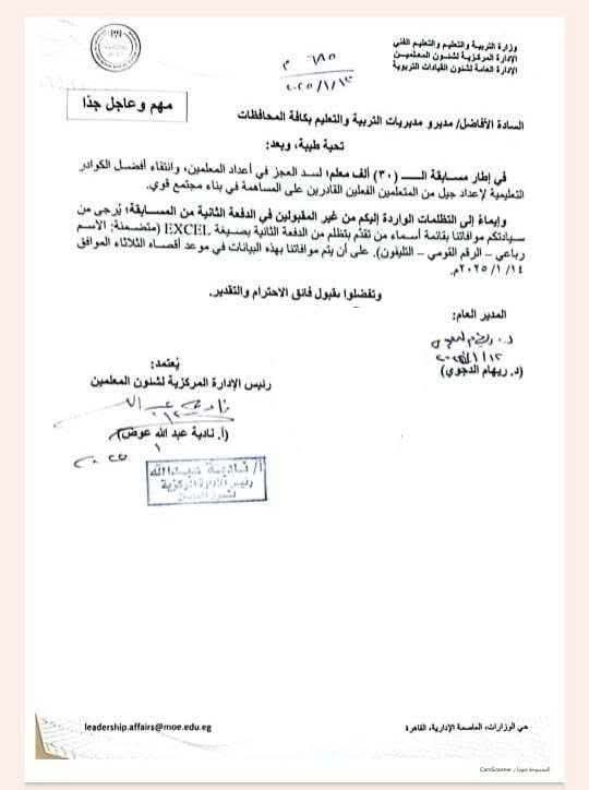 وقالت الوزارة في خطابها، إنه في إطار مسابقة الـ 30 ألف معلم لسد العجز في أعداد المعلمين، وانتقاء أفضل الكوادر التعليمية لإعداد جيل من المتعلمين الفعلين القادرين على المساهمة في بناء مجتمع قوي، فإنه إيماء إلى التظلمات الواردة إليكم من غير المقبولين في الدفعة الثانية من المسابقة، يرجى عمل قائمة أسماء من تقدم بتظلم من الدفعة الثانية بصيغة EXCEL (متضمنة: الاسم رباعي - الرقم القومي - التليفون)، على أن يتم موافاتنا بهذه البيانات في موعد أقصاه الثلاثاء الموافق 14 يناير 2024.