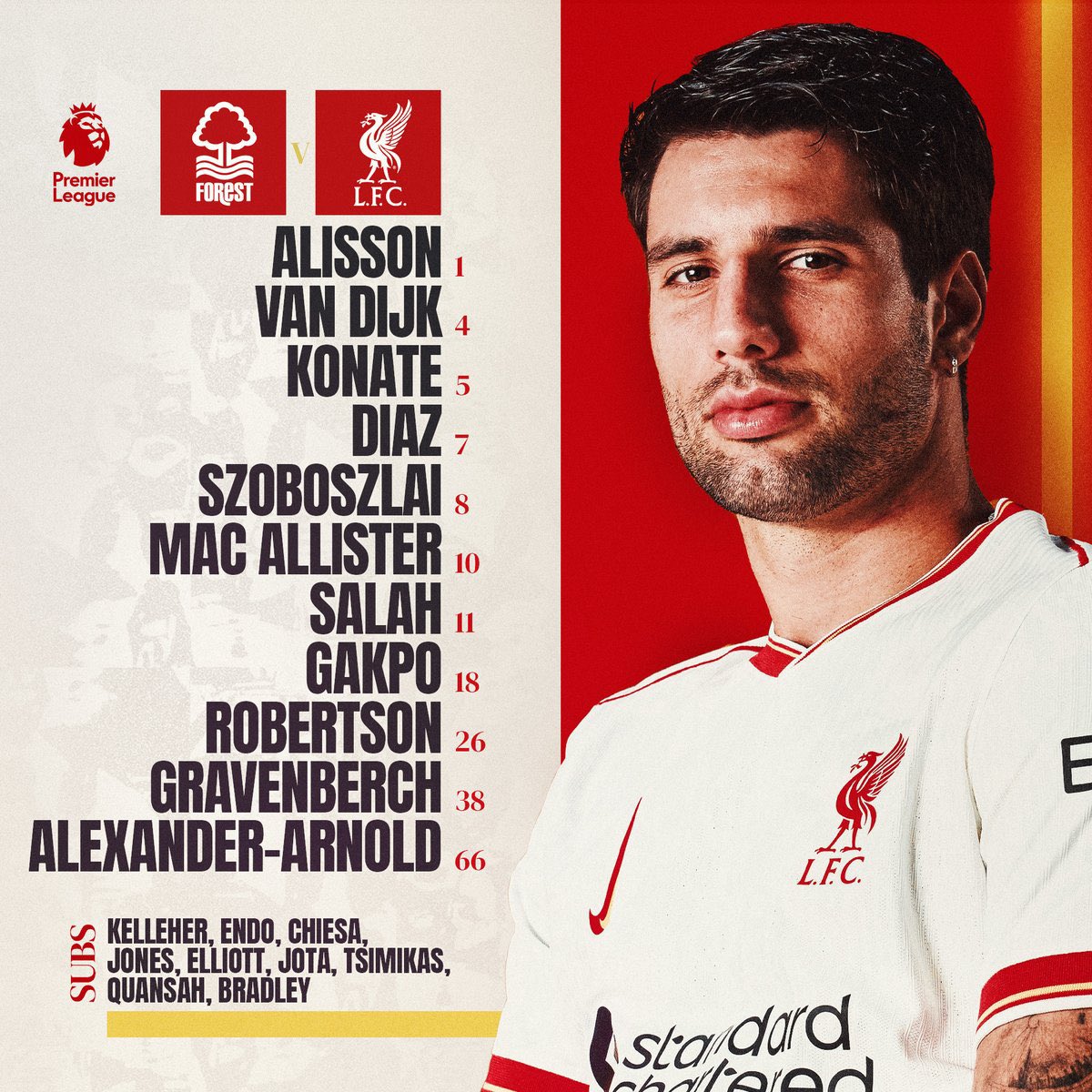 قرر آرني سلوت مدرب ليفربول، أن يخوض مباراة فريقه لمواجهة نظيره فريق نوتنجهام فورست في الدوري الإنجليزي الممتاز، بتشكيل مكون من: