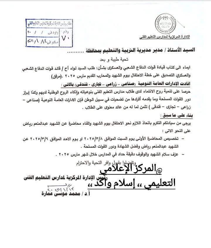 أرسلت الإدارة المركزية لمدارس التعليم الفني خطابا إلى المديريات التعليمية بتخصيص المحاضرة الأولى يوم السبت الموافق 8 مارس المقبل، أو يوم الأحد 9 مارس 2025، للاحتفال بيوم الشهيد، وإلقاء محاضرة عن الشهيد عبد المنعم رياض وفضل الشهادة ودور القوات المسلحة، وعزف سلام الشهيد والوقوف دقيقة حداد في المدارس خلال شهر مارس 2025.