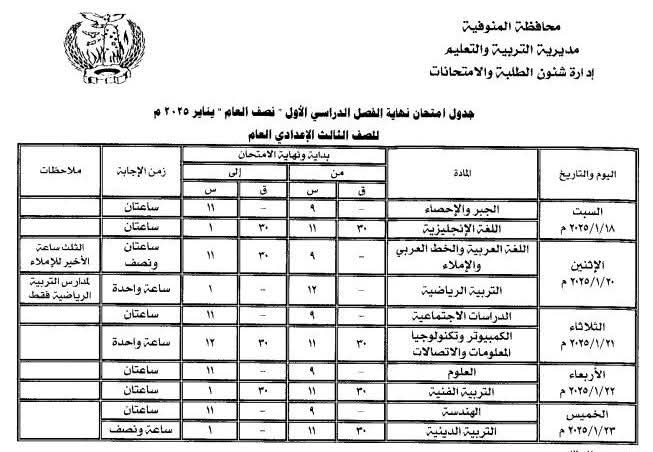 بمشاركة 86 ألف طالب.. ننشر جدول امتحانات الشهادة الإعدادية بالمنوفية