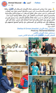 وعبر أحمد مراد عن سعادته بهذه الزيارة من خلال منشور على صفحته الرسمية بموقع التواصل الاجتماعي فيسبوك، قال فيه: سعيد جدًا بزيارتي لمستشفى شفاء الأورمان للسرطان في الأقصر، برفقة الصديق العزيز والسيناريست تامر حبيب، والمنتج المميز معتز عبد الوهاب، المستشفى ده مش مجرد مكان لعلاج السرطان، ده نموذج للأمل والإنسانية والتصميم الرائع، خاصة قسم الأطفال اللي بيمثل طاقة إيجابية كبيرة جدًا.