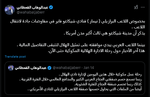 وأكد الصحفي السعودي عبد الوهاب القحطاني، أن نادي شيكاجو فاير الأمريكي دخل في مفاوضات جادة للتعاقد مع النجم البرازيلي نيمار لاعب فريق الهلال السعودي خلال فترة الانتقالات الشتوية الجارية، بينما اللاعب محمد صلاح أبدى موافقته على تمثيل الهلال لتتبقى التفاصيل المالية.