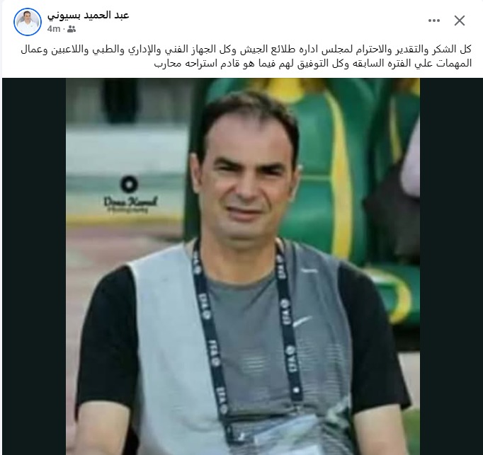 وكتب عبد الحميد بسيوني عبر حسابه الرسمي على فيس بوك: كل الشكر والتقدير والاحترام لمجلس إدارة طلائع الجيش وكل الجهاز الفني والإداري والطبي واللاعبين وعمال المهمات على الفترة السابقة، وكل التوفيق لهم فيما هو قادم، استراحة محارب.
