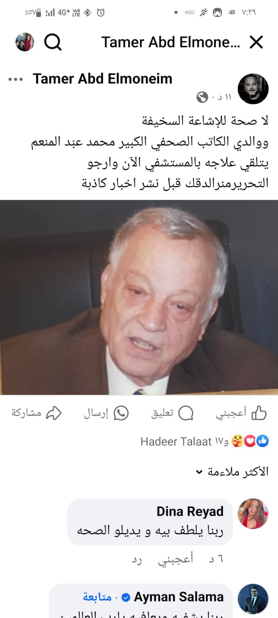 ونشر الفنان تامر عبد المنعم صورة لوالده الكاتب الصحفي محمد عبد المنعم وعلق عليها قائلًا: لا صحة للإشاعة السخيفة، ووالدي الكاتب الصحفي الكبير محمد عبّد المنعم يتلقى علاجه بالمستشفى الآن وارجو تحري الدقة قبل نشر أخبار كاذبة.