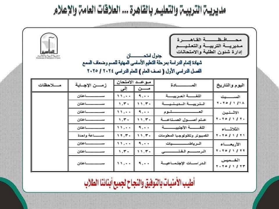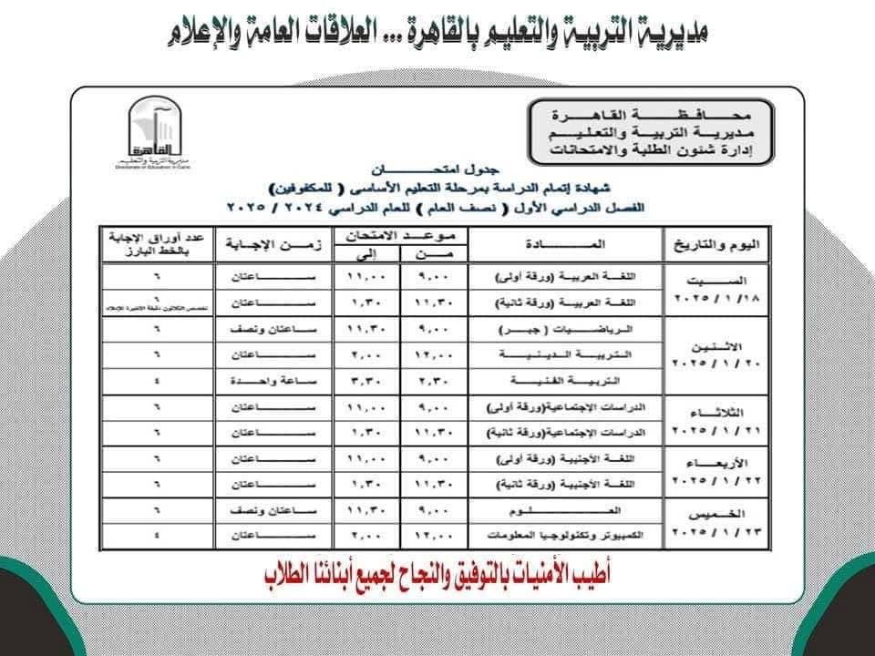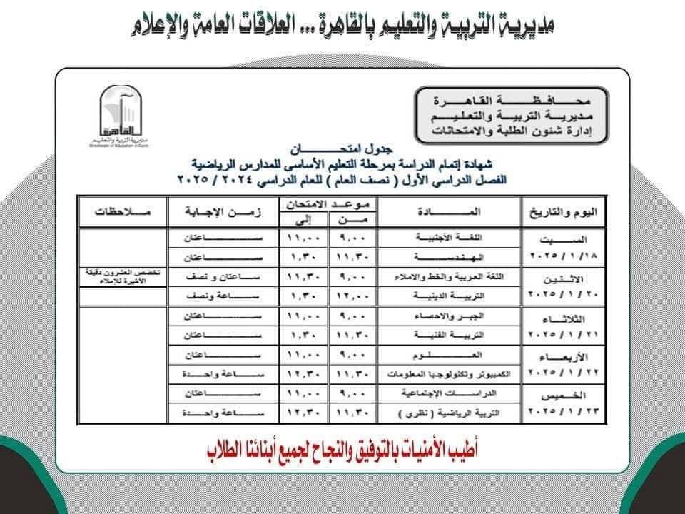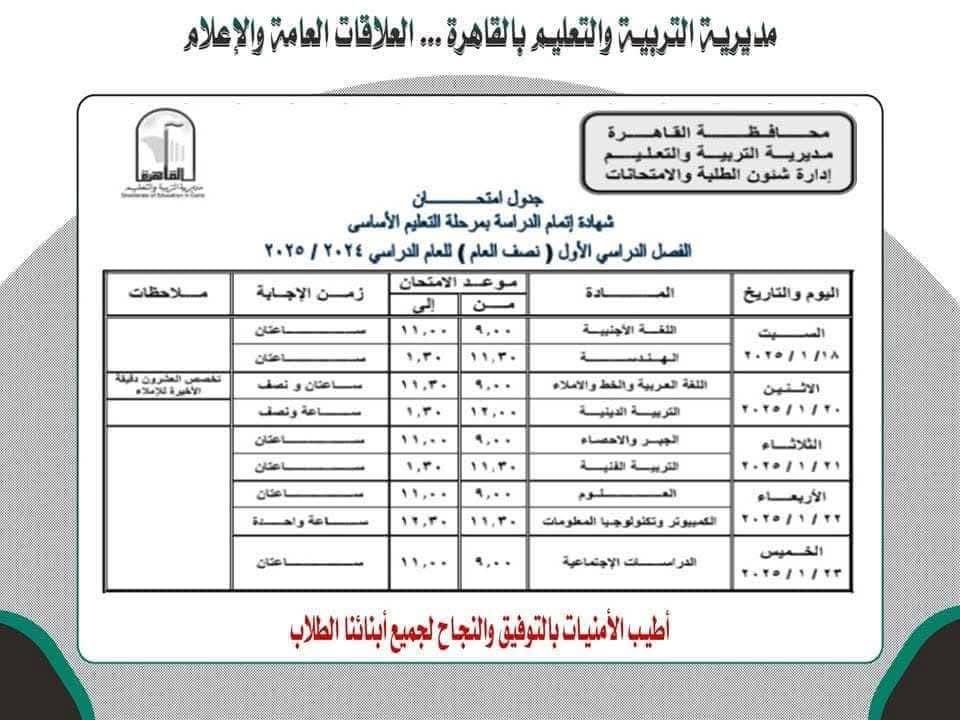 أعلنت مديرية التربية والتعليم بمحافظة القاهرة، جدول امتحان شهادة إتمام الدراسة بمرحلة التعليم الأساس، وذلك لـ الفصل الدراسي الأول -نصف العام- للعام الدراسي 2025/2024.