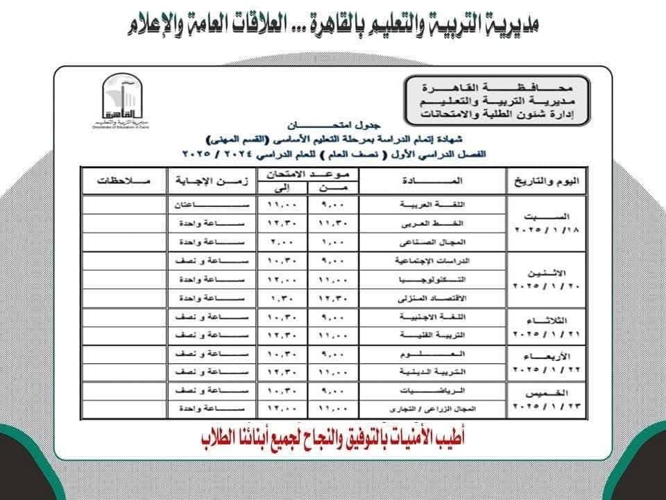 تعليم القاهرة تعلن جدول امتحانات التيرم الأول للشهادة الإعدادية