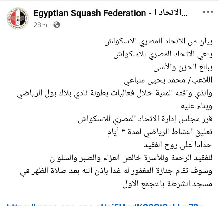 ونعى الاتحاد المصري للإسكواش اللاعب محمد يحيى سباعي، والذي توفي اليوم، وجاء بيان الاتحاد كالتالي: